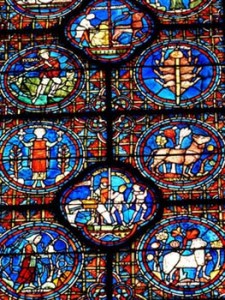 – Les vitraux : la cathédrale de Chartres possède le plus important ensemble vitré du XIIIe siècle, remarquablement préservé jusqu’à ce jour. Du XIIe siècle, trois verrières sont conservées, avec notamment des bleus inimitables. Le nombre remarquable de 176 vitraux (petites roses comprises) correspond à une surface de 2 600 m². Pour la plupart, ils représentent des saints et saintes ou des personnages de la Bible : (Noé, Joseph, le Bon Samaritain, le Fils Prodigue…) mais aussi de la Légende dorée de Jacques de Voragine (dominicain italien du XIIIe siècle).