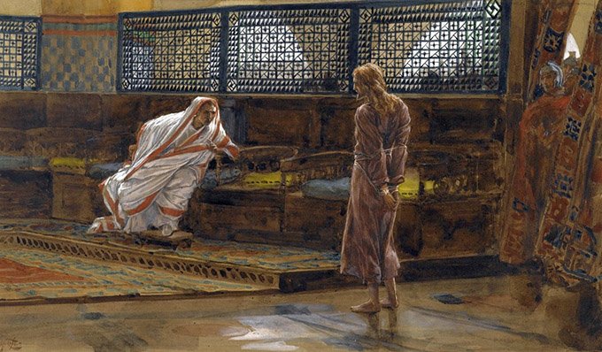 Alors ils mènent Jésus de chez Caïphe au prétoire. C’était le matin. Eux-mêmes n’entrèrent pas dans le prétoire, pour ne pas se souiller, mais pour pouvoir manger la Pâque.